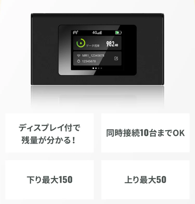 WiFi端末は画面付きタイプなので、残容量も見れて使いやすい点もユーザー目線で嬉しいポイントです。契約不要・縛りもなしで、